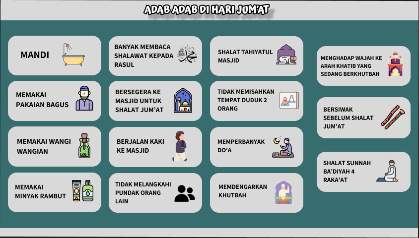 Hari Jumat adalah hari yang mulia, dan kaum muslimin di seluruh penjuru dunia memuliakannya. Keutamaan yang besar tersebut menuntut umat Islam untuk mempelajari petunjuk Rasulullah dan sahabatnya, bagaimana seharusnya menyambut hari tersebut agar amal kita tidak sia-sia dan mendapatkan pahala dari Allah ta’ala. Berikut ini beberapa adab pada hari Jumat yang harus diperhatikan bagi setiap muslim yang ingin menghidupkan syariat Nabi shallallahu ‘alaihi wa sallam